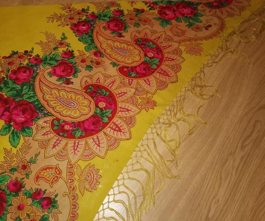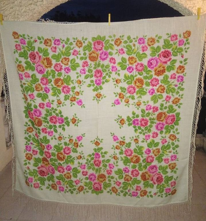Старинная большая шаль, на кремовом фоне разноцветный цветочный рисунок