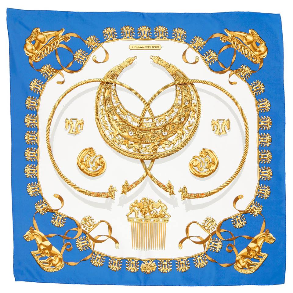 Платок Hermès "Les Cavaliers d'or" (Золотые всадники), автор Vladimir Rybatlchenko, был впервые выпущен в конце 1975 года, в честь масштабной выставки "Скифское золото" из собраний музеев СССР, которая прошла в конце 1975 в музее Метрополитен в Нью Йорке, а следом, с апреля 1976 года, в Парижском Гран Пале.