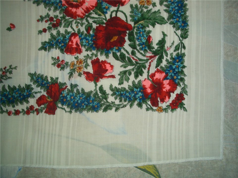 Хвать - а платок-то не с подрубкой, а обработанный оверлоком. Ага, - понимаю, - всё ясно, отбраковку продают. И вот так, отдавая себе отчёт в своих действиях, всё же купила и понесла домой, скептически ожидая всяких гадостей. С первого-то взгляда их было не видно, как и обещалось.